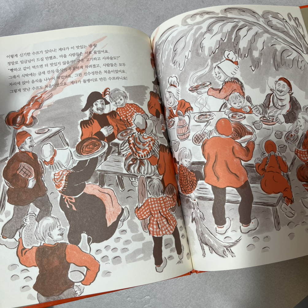 군인 셋은 그날 밤, 신부님 집, 빵 장수의 집, 시장님 집에서 각각 잠을 자고 마을 사람들의 따뜻한 배웅 속에 길을 떠난다. 커다란 솥 안의 수프가 모두의 참여로 맛있는 식사가 된 것처럼 그림책 톡톡에 오시는 한 분 한 분의 이야깃거리가 모임을 풍요롭게 완성시켜준다는 생각이 들었다. 내가 가진 것을 나눌 여유와 용기만 있다면 돌멩이 수프가 일러주는 풍요로운 마법은 언제든 가능한 작은 기적이다.