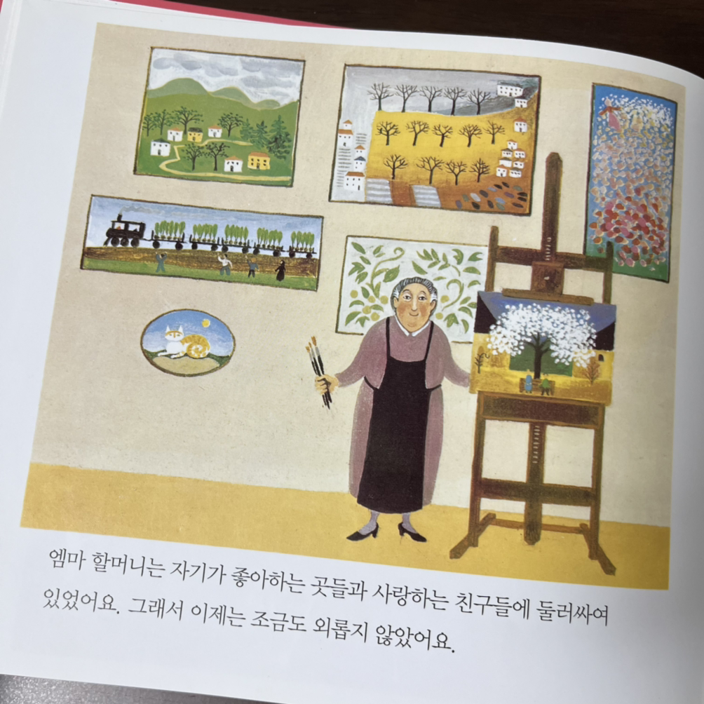 할머니가 기억하는 고향 마을은 그렇게 세상 밖으로 나온다. 어린 시절로 돌아가 좋아하던 기억들을 만나고 그것들을 표현하는 삶 속에서 할머니는 어떤 마음이었을까? 계속 그리라고 응원해 준 가족들 또한 알지 못했던 할머니의 어린 시절을 그림으로 만나는 뜻깊은 시간이었을 것이다. 엠마 할머니에게는 그림이 도구가 되었지만 어떤 사람에게는 글쓰기가 될 수도 있고 혹은 악기 연주가 될 수도 있다.