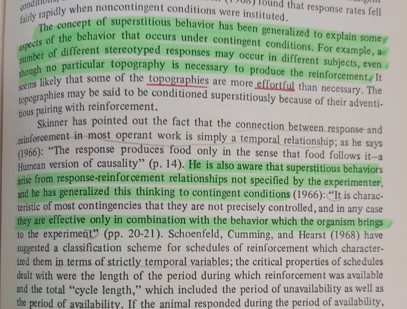 "The concept of superstitious behavior has been generalized to explain some aspect of the behavior that occurs under contingent conditions. For example, a number of different stereotyped responses may occur in different subjects, even though no particular topography is necessary to produce the reinforcement. It seems likely that some of the topographies are more effortful than necessary. The topography may be said to be conditioned superstitious because of their adventitious pairing with reinforcement." (p.307)