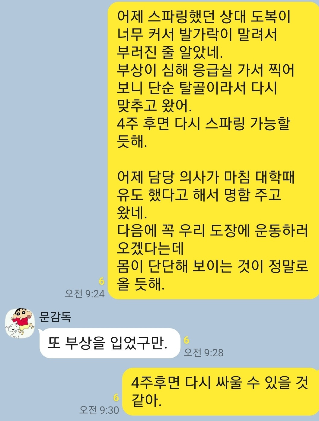 스파링 상황에서는 극도로 흥분했기에 고통을 잘 느끼지 못했고 걱정하는 회원들이랑 학생들에게는 괜찮다면 수업을 마무리하고는 서둘러 응급실로 향했습니다. 그리고 한 동안 참고 지냈던 내향화가 시작 되었습니다.