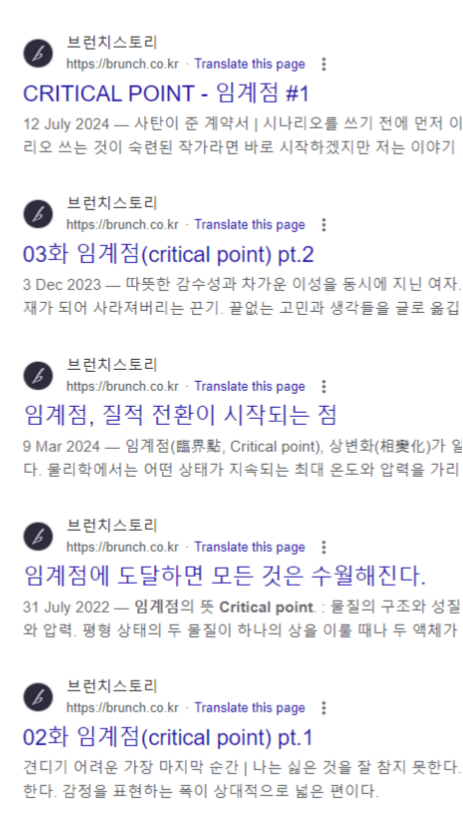 여하튼 대근이가 사모 살딜도 노릇을 하면서 그 치마 폭에서 다시 Sub 세계관을 만들어 건들거리며 호텔을 휘젓고 다니는 모습을 볼 때마다 벨이 꼴려 언젠가 뭐 하나 나한테 걸리기만 걸리면 반 죽여놓겠다 이를 갈던 차, 하루는 놈이 잘 쓰는 그 두 단어 '브런치'랑 '임계점'을 검색기에 돌려 보았는데 뜻밖에 놀라운 수확을 했다.