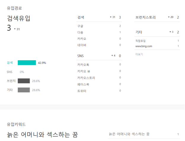 이런 작은 개별 통계는 큰 의미가 없을 수는 있는데 제가 늘 관심 가지고 보는 것은 그 아래 유입 키워드입니다. 재미있는 것이 많아서 가끔 소개해드릴까 생각도 했지만 그런 사소한 감정 하나로 글을 뽑아내기에는 무리가 있어서 혼자 웃고 넘기는 경우가 많은데요. 친구가 없는 저로서는 누군가 만나서 브런치를 이해하는 사람이면 꼭 언젠가 재미있게 이야기하겠다고 넘겼습니다. 하지만 1년 넘게 브런치에서 활동하며 이 검색어를 유심히 살펴보다 보니 몇 가지 공통된 것이 보입니다.