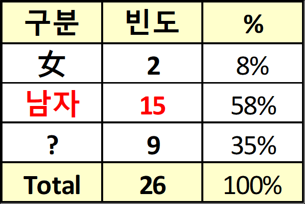 그렇다고 이런 재미있는 자료에 아무런 예측도 없이 끝낸다면 그것도 심심하니 제가 할 수 있는 영역에서 제 마음대로 재단하고 예단할 부분은 키워드 검색자들 성별입니다. 우리 기표에는 그 사용자 성별이 명확한 경우가 있는데 가령 "형수"를 찾는 사람은 남자일 것이고 "사위"를 궁금해하는 분은 여성일 확률이 거의 100%겠습니다. 물론 모든 기표에 이런 성구분이 된 것은 아니기에 이를 조금 더 확장해 본다면 아래처럼 됩니다.