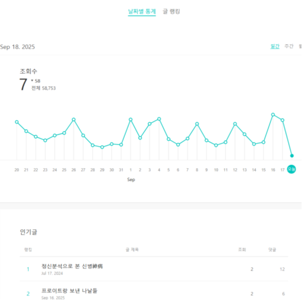 집단 무의식이란 존재할 수 없고, 개인 무의식이라는 것도 쉽게 포착할 수 있는 것이 아니라지만 제 글을 찾는 사람들 속내를 살펴보고 그로 인해 제 글이 나아갈 방향 정도는 분석하겠습니다. 무엇보다 이것은 브런치 작가인 자만이 할 수 있고 제 통계라서 재미있고요. 아쉽게도 진즉에 이런 생각을 했으면 일찍부터 자료를 착실하게 모았어야 하는데 지난 시간을 허투루 보낸 것이 후회가 됩니다. 매번 인생 낭비하다 못해 무능력하고 늦게 깨닫는 제 자신을 또 마주하니 안타깝고요.