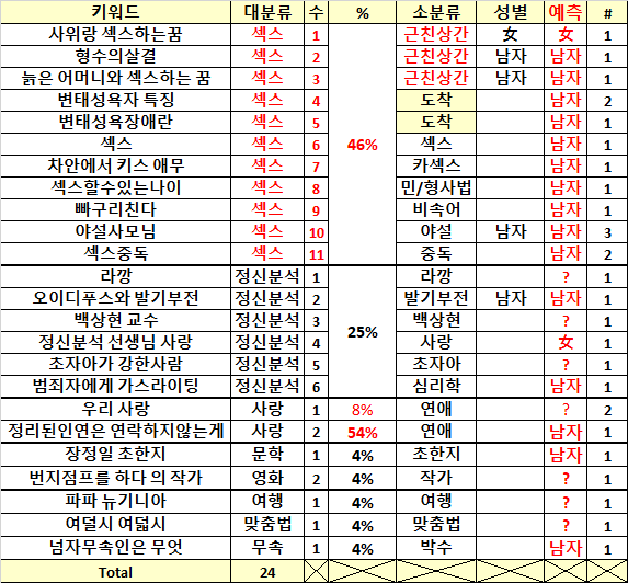 다음으로는 정신분석에 대한 글을 주로 올리는 제 상황에 맞게 심리학 관련 주제가 많은데 이것은 단순히 제가 그런 글을 쓰기 때문으로 크게 의미를 더할 것은 없어 보입니다. 사랑은 섹스랑 연결되었거나 또 다른 억제된 표현이라고 하면 화낼 분들이 계시겠지만 분석 편의상 그렇게 치부한다면 섹스 관련 키워드 비중은 전체 54%나 되며 기타 문화 영화 따위는 모두 더해도 21% 수준입니다.