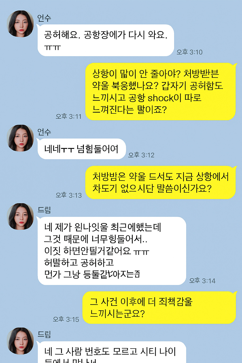 (공황이겠지.. Air Port에 장애가 온들 니가 신경 쓸 사람도 아니고..) 상황이 많이 안 좋아요? 처방받은 약을 복용했나요? 갑자기 공허함도 느끼시고 공황 shock이 따로 느껴진다는 말이죠?