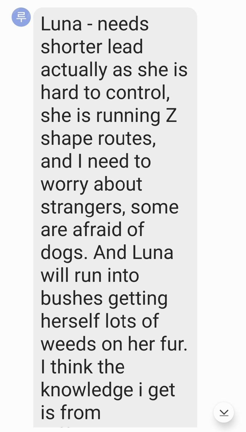 루나는 제 멋대로 뛰어다니기에, 긴 줄로는 제어가 어렵고요. 행인 중에 개를 무서워하는 경우, 달려들까 봐 걱정이 되어서요. 그리고 루나는 종종 풀 속으로 들어가는데 털에 온통 잡풀을 달고 온답니다. 그래서 전문가들이 말하는 것이랑 현실은 달라요. 그리고 근처 개공원에는 데리고 가지 마세요. 거긴 진흙 투성이에 가끔 개들끼리 싸움도 있답니다. 알다시피 개는 우리 마음 같지 않아요. 그리고 호주에서 인기 종인 불독도 공원에 많아서 위험하고요.