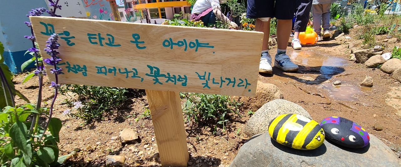 꽃밭 선생님께는 참으로 예쁘디예쁜 말이 적힌 팻말을 꽃밭에 꽂아주셨다. '꽃을 타고 온 아이야, 꽃처럼 피어나고 꽃처럼 빛나거라.' 읽는 순간 가슴이 뭉클했다.