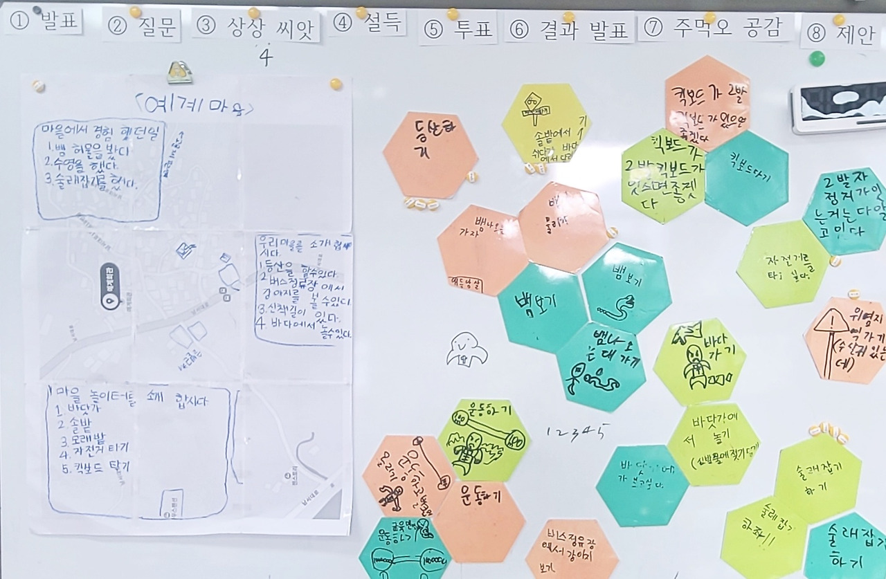 오늘은 6개의 마을 중에서 현준, 준우, 민찬 3명의 친구들이 살고 있는 ‘예계 마을’에 대해 이야기 나누는 날이다. 수업은 ‘1. 마을 소개 - 2. 질문 - 3. 상상씨앗(예계 마을에서 해보고 싶은 일) - 4. 설득 - 5. 투표 - 6. 결과 발표 - 7. 주먹오 공감 - 8. 제안’의 순으로 진행되었다. 유심히 살펴보면 ‘함께’라는 학급 철학이 녹아든 수업의 흐름이었다.