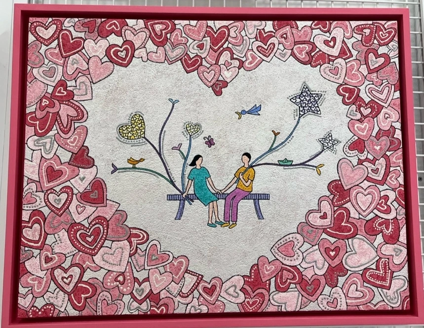 그림 속 커플은 서로의 한 손과 한 발을 포개어 놓았다. 그리고 다른 한손엔 남자는 별이 달린 나뭇가지를 여자는 하트가 달린 나뭇가지를 쥐고 서로를 바라본다. 이 두 커플을 하트투성이들이 하트 렌즈를 만들어 사랑의 눈으로 그들을 바라본다. 연애하던 시절이 갑자기 떠올랐다. 추운 겨울에 손이 추워 빨개진 내 손을 따뜻한 손으로 감싸주던 남편의 사랑이 생각났다. 손을 꼭 잡아주던 그 사랑이 이제 잔소리로 옮겨졌다는걸 갑자기 깨달았다. 사랑의 잔소리. 듣기 싫을 때도, 답답할때도 있지만 그 잔소리 덕분에 우리가 사랑을 그리며 살아가는게 아닌가 하는 생각을 한다. 힘든 하루 중에도 나를 위해 저녁밥을 해주던 남편의 뒷모습이 떠오른다. 없는 시간을 쪼개면서 나와 함께 하려고 애쓰는 남편의 사랑에 고마움을 느낀다. 그 사랑에 보답하고 싶다. 나도 사랑받는 아내가 아니라 사랑을 주는 아내로 살고 싶다.
