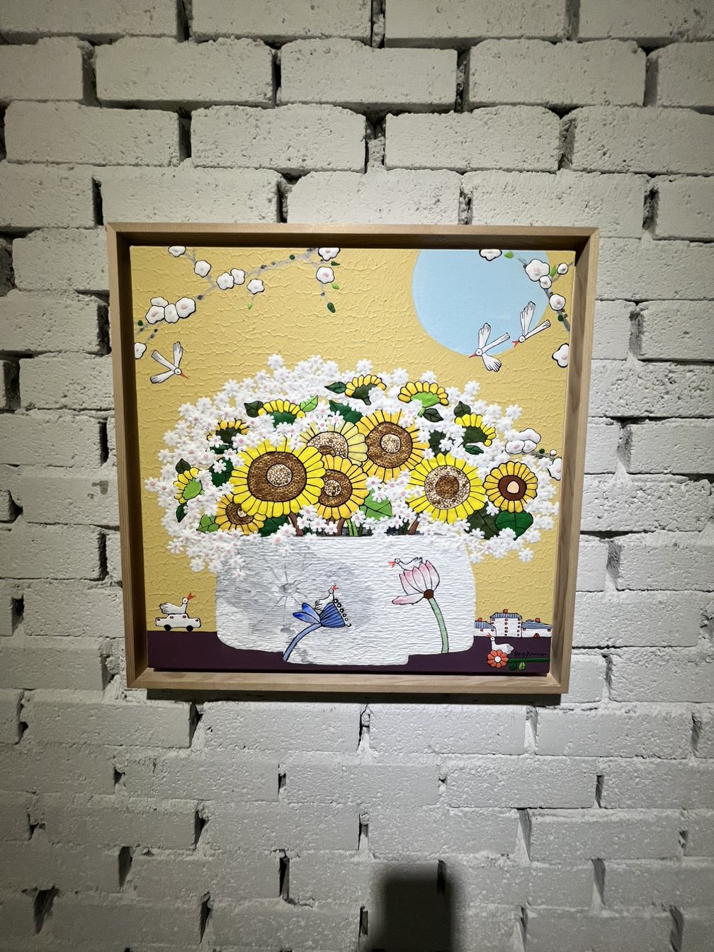 온몸을 구석구석 샤워한다. 해바라기가 샤워하는 모습을 두루미가 날아와 구경한다. 안개꽃 향기일까 해바라기 향기일까 꽃향기에 끌려 온 두루미는 연꽃에 앉아서 해바라기를 바라본다. 해바라기는 안개꽃에 둘러앉아 때 빼고 광을 낸다. 열심히 목욕을 하고 있는 해바라기가 방긋 웃는다.