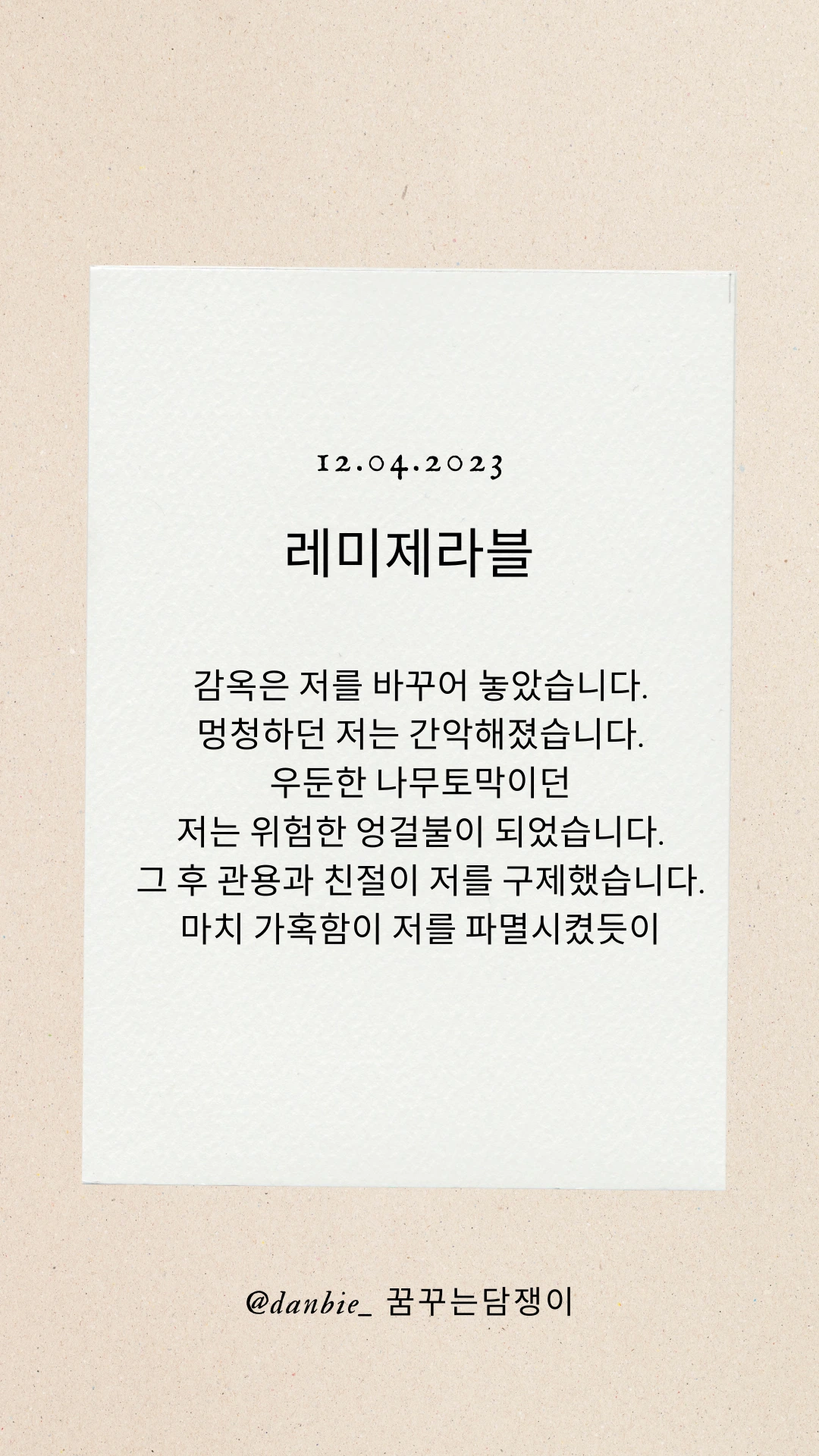 아침에 읽은 <<레미제라블>> 책에서 하나의 문장이 마음에 다가온다.
