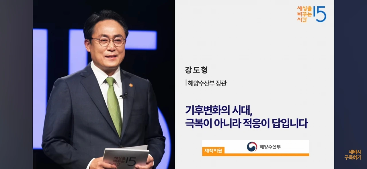 강도형 해양수산부 장관이 이번달 8일 '세상을 바꾸는 시간 15분' 강연장에서 강연하고 있다./ 세상을 바꾸는 시간 15분 제공"기후변화는 예견됐다. 개인, 사회, 정부는 이 변화를 수용해 적응하고 실천해야 더 나은 세상을 만들 수 있다"