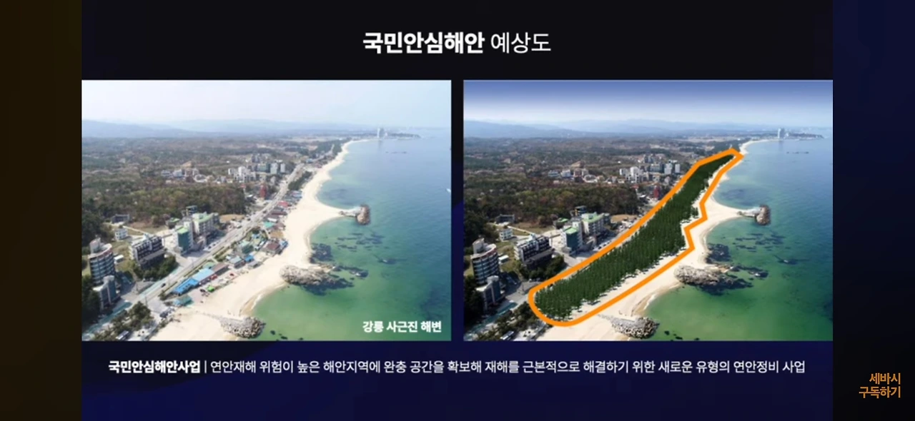 둘째는 국민안심해안 사업이다. 그는 이 사업이 해수욕장에 숲을 조성해 태풍 등 자연재해가 바닷가 근처에 있는 주택, 가게 등에게 피해를 줄이거나 제거하는 완충지대를 형성한다며 국민들은 이 숲에서 바닷가 경치를 즐길 수 있고 이 일대 주민들은 자연재해로부터 보호를 받은 효과를 거둔다고 전했다.