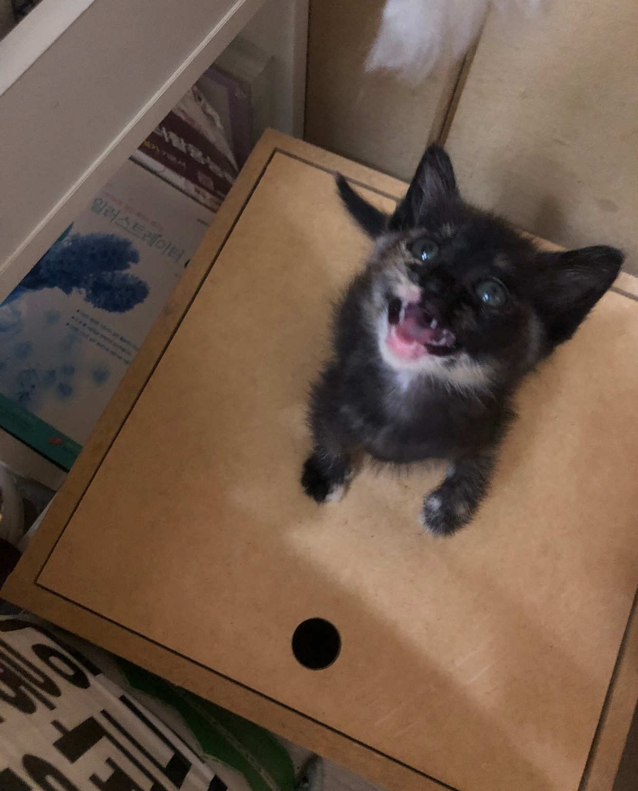 속절없이 시간이 흘러 금요일이 되었다. 그사이 새끼 고양이는 모두의 '박스냥'이 되어 츄르도 얻어먹고 보살핌을 받는 존재가 되었다.