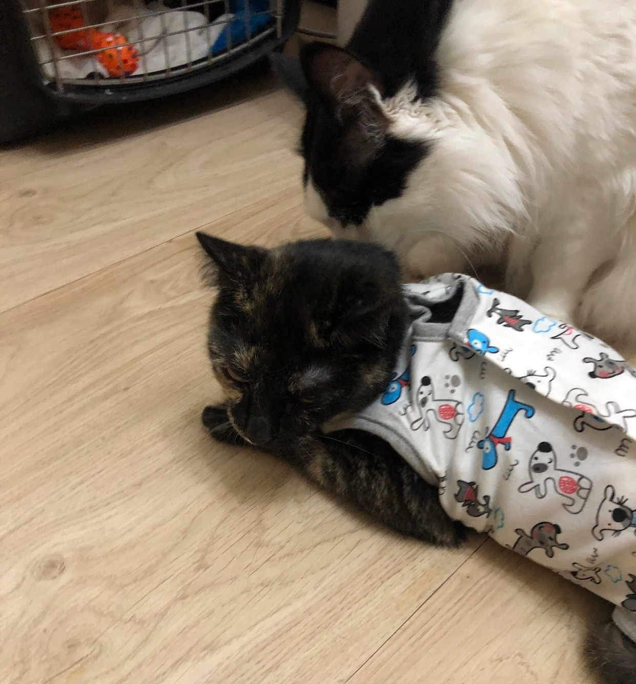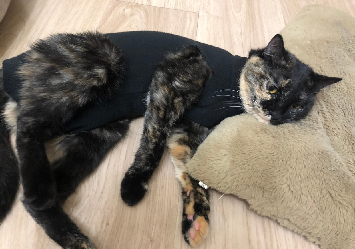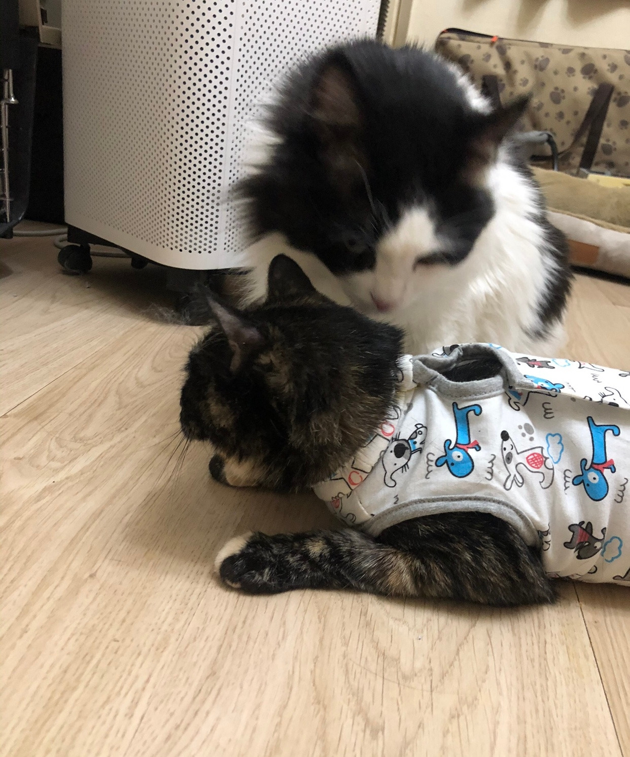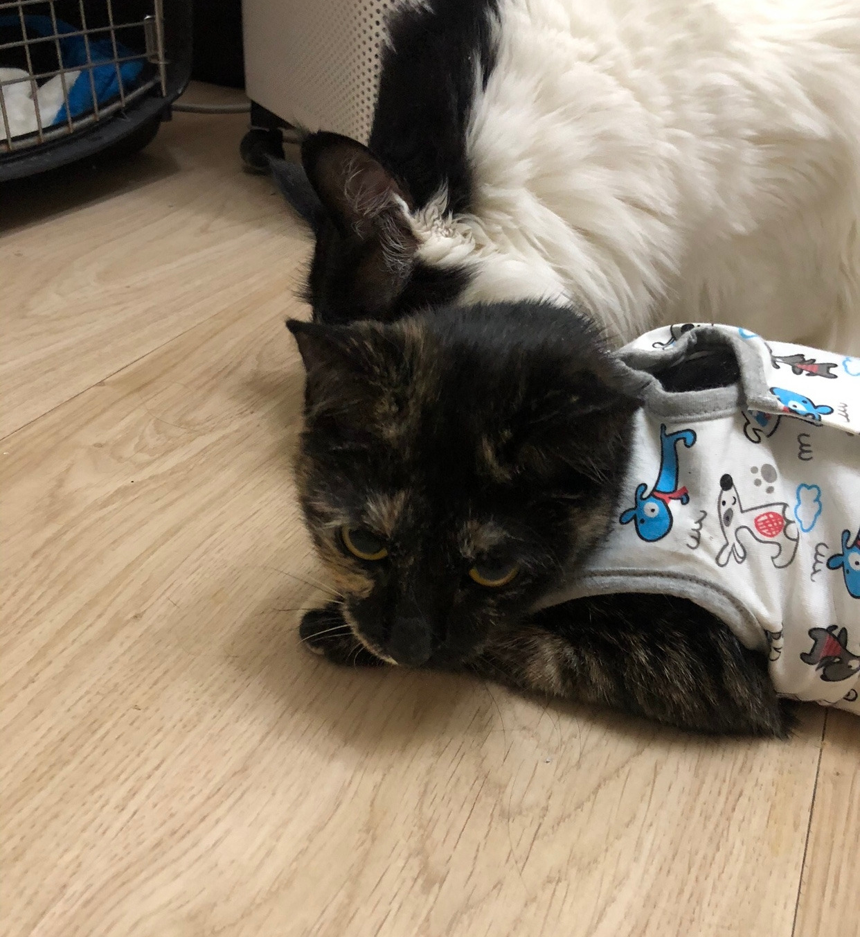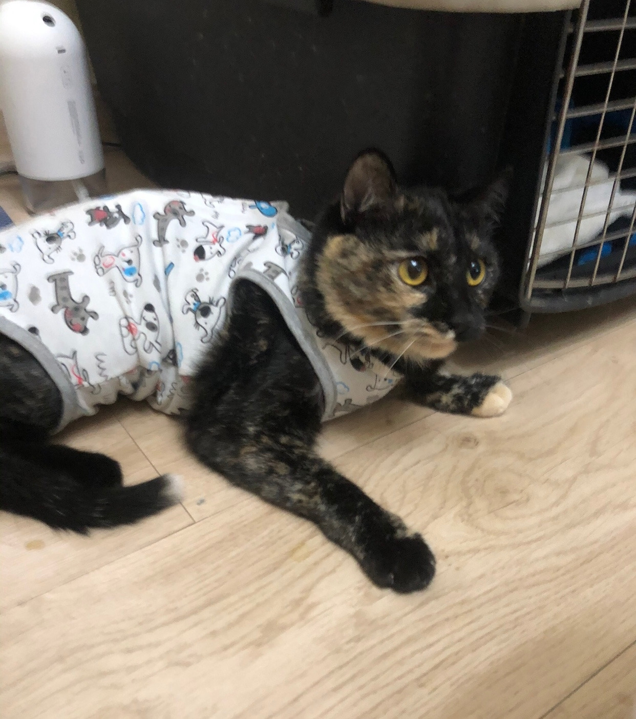 집에 도착해 켄넬 문을 열자, 환묘복을 입은 심바가 몸을 던지듯 뛰쳐나왔다. 몸이 어색한지 캣타워를 올라가려다 실패했다. 그 모습이 안쓰러우면서도, 어딘가 귀여웠다.