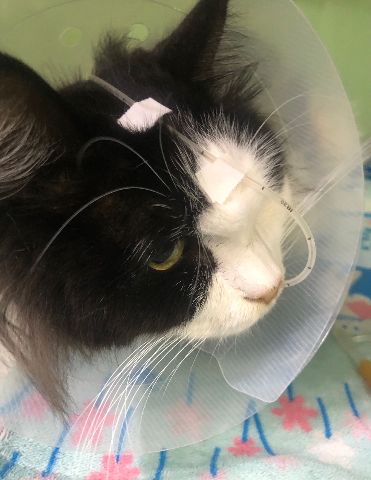 루피는 입원 내내 콧줄을 끼고 있었다. 그 모습이 너무나 마음 아팠다. 우리 깔끔쟁이 루피가 오줌 범벅이 된 채 배를 깔고 누워있다니.