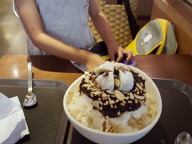 그래서 첫날은 집근처 카페에서 남편이 모아둔 포인트로 팥빙수를 먹었다. 오래 앉아있지는 못했지만 아이는 유치원에서 만든 종이접기 작품을 보여주며 즐거워했다.