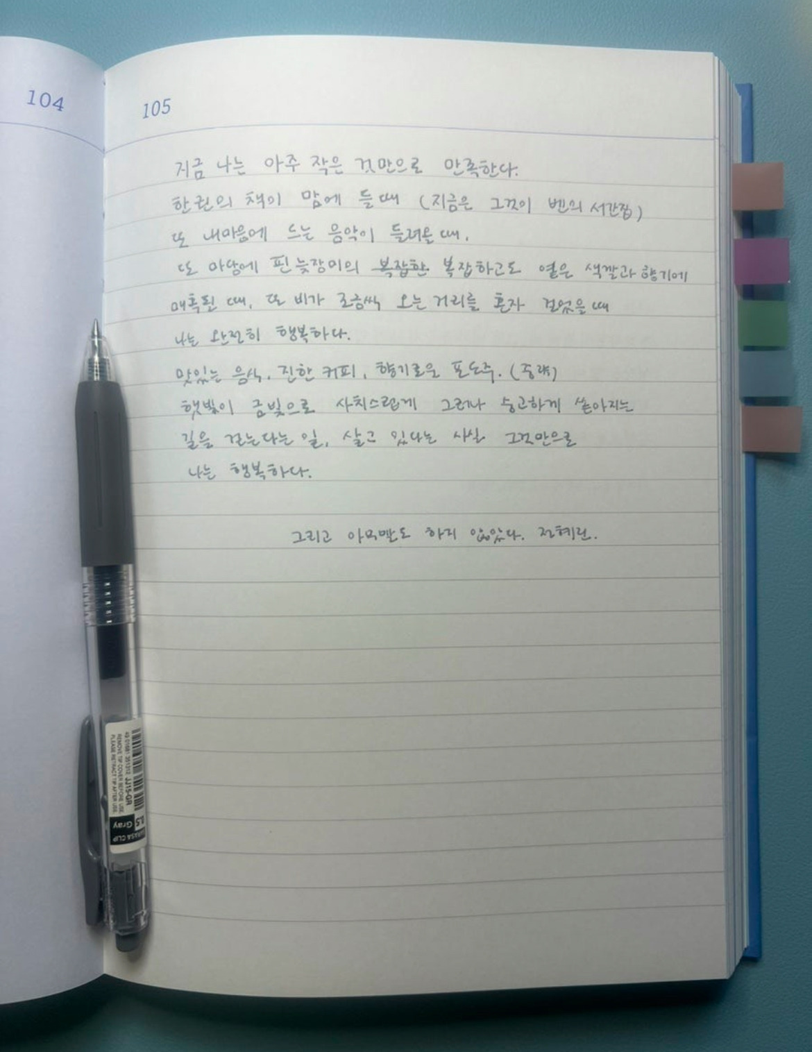 행복했던 순간들을 떠올려 본다. 특별한 날들이 먼저 떠오를 줄 알았다. 여행지에서 찍은 사진이나 무언가를 이루었던 날처럼 의미 있는 장면들이 스쳐 지나갈 줄 알았는데 의외로 마음을 따뜻하게 적신 건 아주 소소한 순간들이었다.