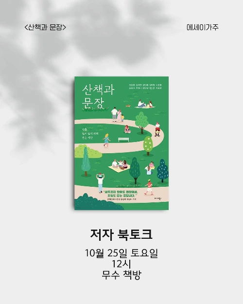 이번 두 번째 북토크 <산책과 문장>에는 조금 다른 바람이 있다. 무수책방이라는 작고 따뜻한 독립서점에서 함께 쓴 작가들과 예비 작가들이 소수로 모여 대화를 나누는 자리. 그곳에서는 일방적인 강연이 아닌 서로의 '이야기'가 머리로 전달되는 지식이 아닌 가슴으로 스며드는 '온기'로 오가길 바란다. 이번에는 내가 오래 상상했던 북토크의 본래 모습에 조금 더 가까워지고 싶다. 나를 조금 더 솔직하게 드러내고 내 언어로 사람들과 연결되고 싶다.