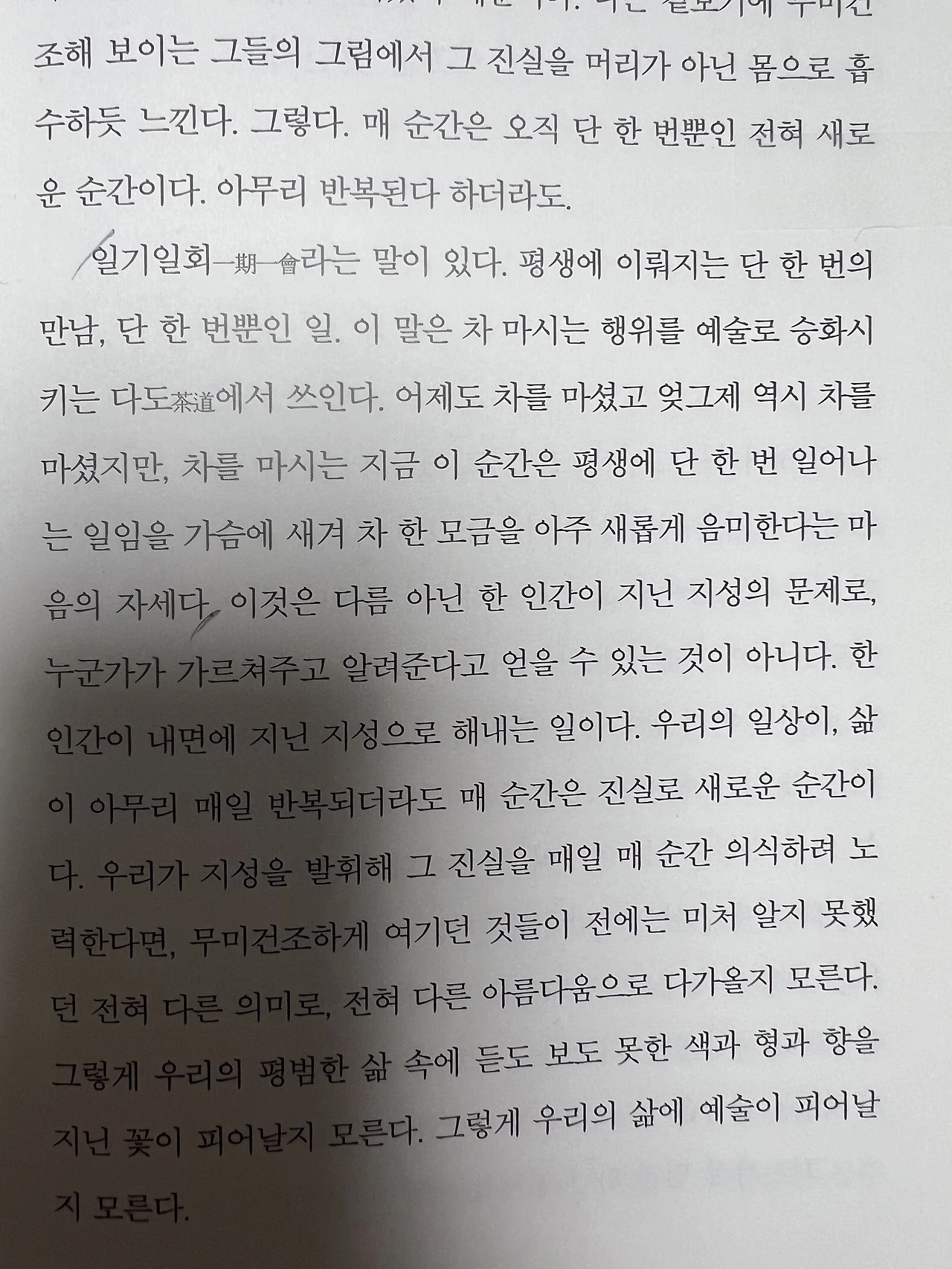 그 틈을 알아보는 일, 무심코 지나칠 수 있는 순간에서 의미를 발견하는 일. 그게 어쩌면 ‘지성’이라는 이름의 감각인지도 모른다. 평범한 삶 속에서 작게나마 예술의 감각을 일깨우며 사는 일인지도 모른다.일상을 예술처럼 대하는 것. 반복되는 하루 속에서 한 번뿐인 순간을 발견하는 것. 그것이 어쩌면 우리가 삶을 아름답게 살아내는 방식이다.