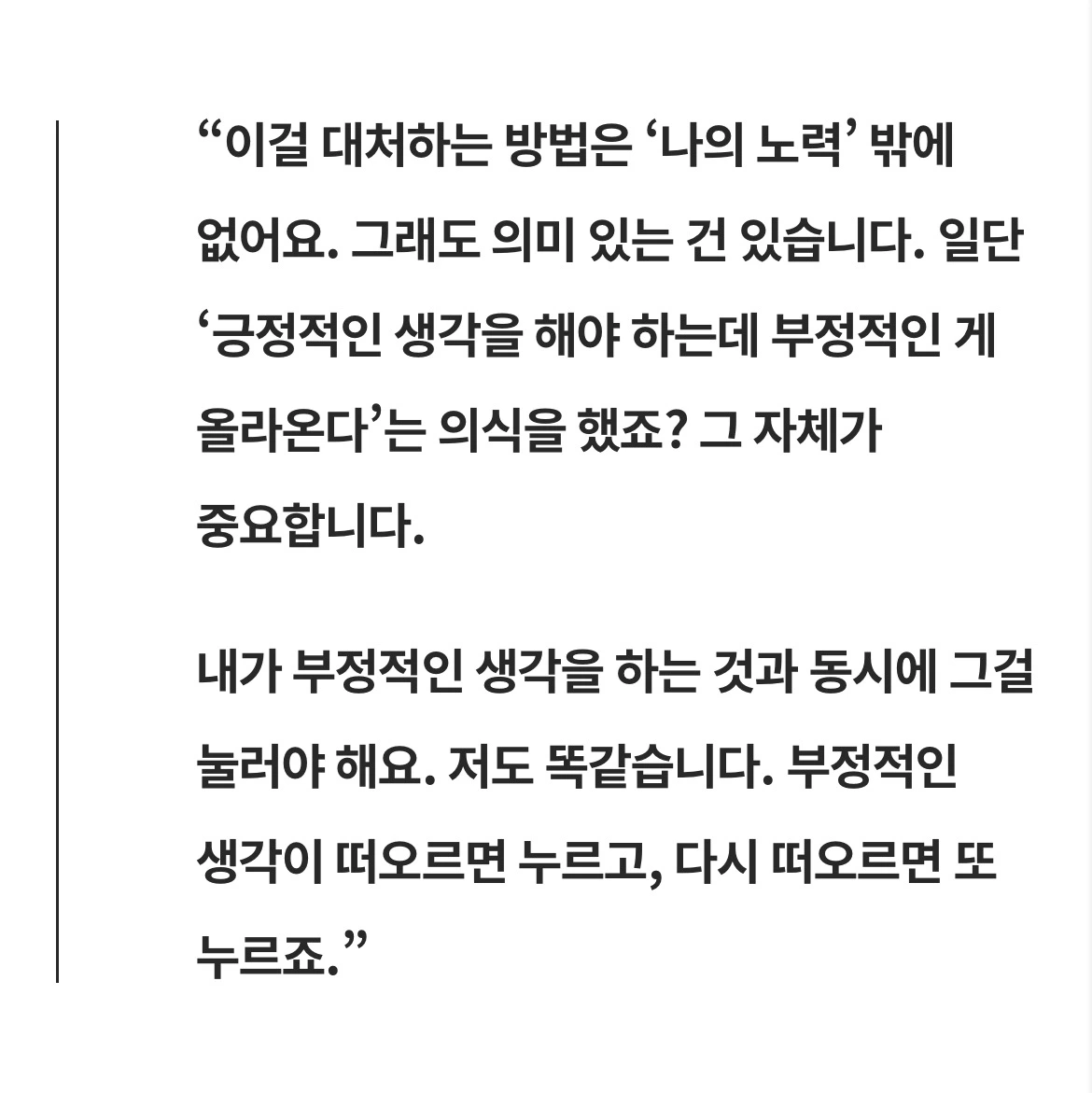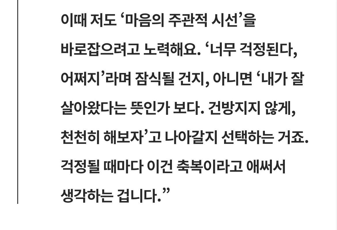 복기할수록 아쉬운 장면들이 고개를 들었다. 하지만 글은 분명히 말하고 있었다. 부정적인 생각이 떠올랐다는 사실을 인식하는 순간부터 이미 '선택'은 시작된다고. 후회를 누르고 긍정으로 시선을 옮기는 반복이 결국 생각의 주도권을 되찾는 과정이라는 것이라고.