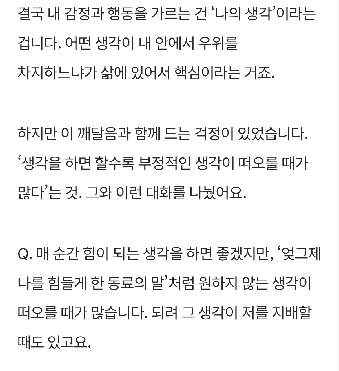 "감정과 행동을 가르는 기준은 생각이다. 어떤 생각이 내 안에서 우위를 차지하느냐에 따라 삶의 방향이 달라진다."