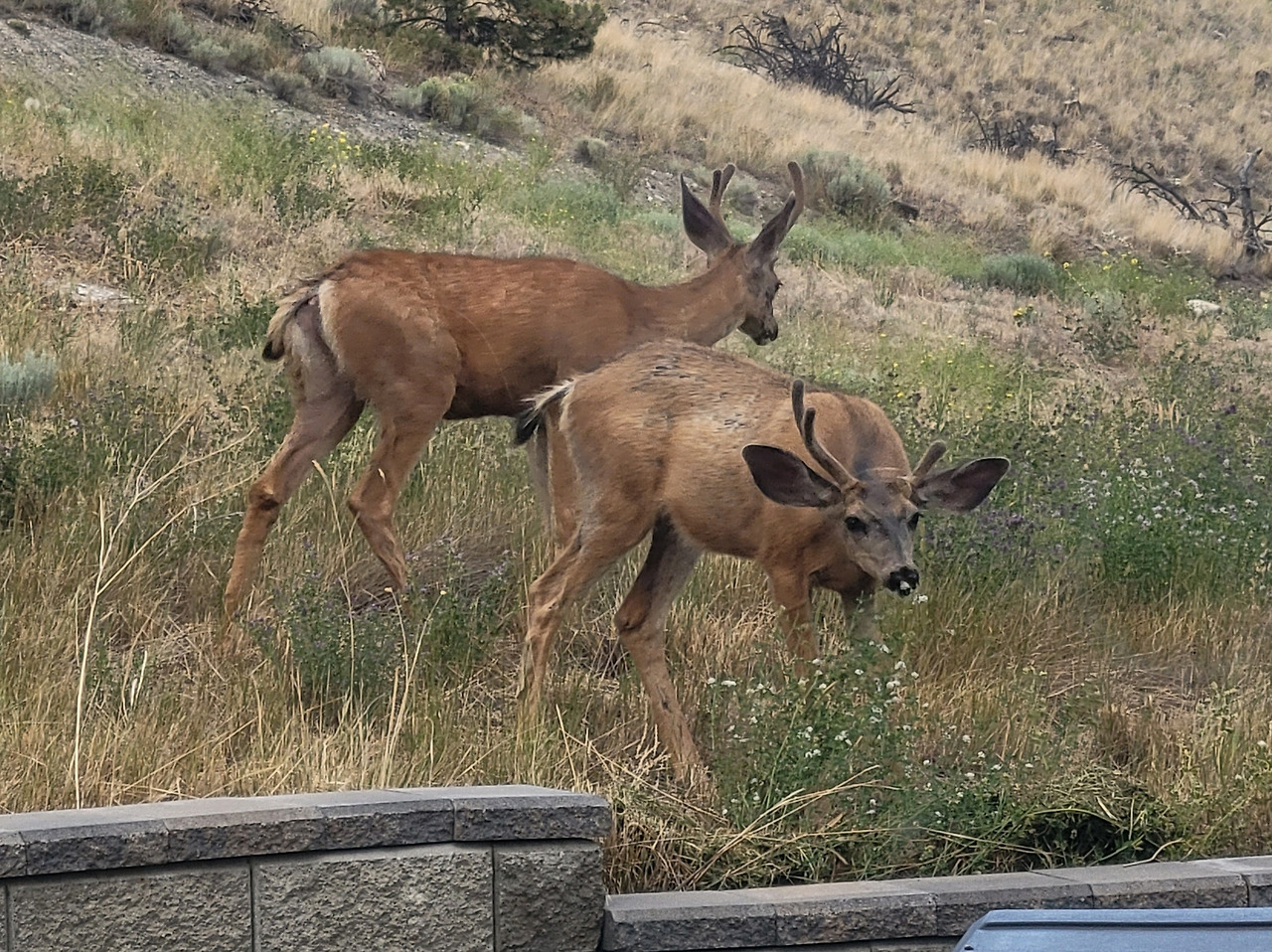 도시에 살았을 때도 여러 동물들이 수시로 동네에 나타났었는데 이곳은 시골이라 그런지 더 자주 만나게 된다. 다람쥐, 사슴, 마멋, 코요테, 곰, 쿠거 등이 주로 출몰한다. 코요테, 곰, 쿠거는 아주 위험한 동물들이라 마당에 나가 놀 때도 항상 주의하고 있다. 제일 많이 만나는 사슴 역시 위험할 수 있으므로 가까이 가지 않아야 한다.
