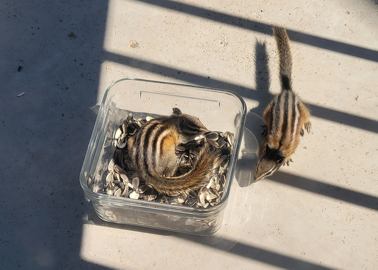 아이들이 다람쥐를 위해 해바라기씨, 물, 블루베리까지 야무지게 챙겨서 뒷문 앞에 놓아두었더니 매일 찾아와 볼 빵빵하게 물어가고 있다. 너무귀여워!!