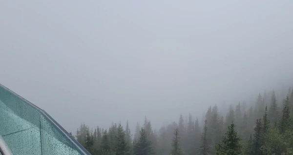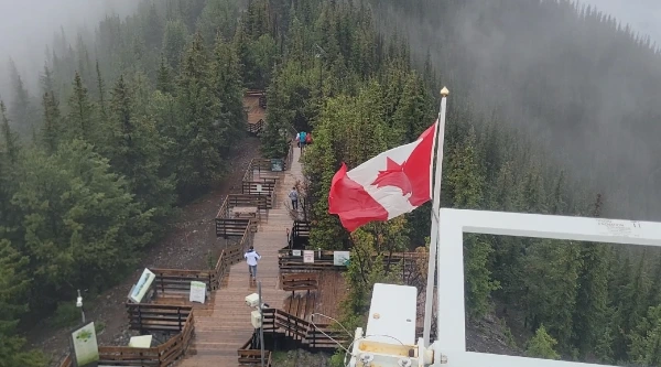 곤돌라는 탑승하자마자 꽤나 빠른 속도로 산 정상을 향해 간다. 놀이기구 타는 것처럼 짜릿하고 신기했다. 아이들은 신이 나서 이쪽저쪽 모두 살펴보며 재미나게 올라갔지만 높은 곳이 무서운 나는 큰아이의 손을 꼭 잡고 최대한 움직이지 않으려 노력했다. 산 아래쪽을 보면 작은 오솔길이 나있는데 곤돌라를 타지 않고도 걸어서 산정상까지 올라갈 수 있는 길이다. 평소에는 꽤 많은 사람들이 있을 것 같은데 오늘은 비가 많이 와서 그런지 걸어서 올라가는 사람이 몇 명 없었다. 7분 정도 걸려 곤돌라는 산정상에 도착한다. 몇 시간째 내리고 있는 비는 하루 종일 올 모양이다. 맑은 날 탁 트인 하늘과 밴프시내, 멀리 로키산맥까지 다 보는 것도 좋았겠지만 촉촉하게 비가 내리고 구름이 흩어져 몽환적인 분위기를 내는 오늘도 나쁘지 않다 싶었다. 설퍼산 정상에는 뷰포인트와 식당, 기프트샵, 전시관, 시청각실, 화장실 등 여러 편의시설들이 잘 갖춰져 있는 큰 건물이 있다. 우리는 곤돌라에서 내리자마자 미리 생각해 두었던 뷔페식당에 가보았다. 점심을 그곳에서 먹으려고 참고 왔는데 클로즈 팻말을 내걸고 단체손님맞이 준비가 한창이었다. 선착순으로 이용가능한 식당이라 예약이 불가능했기에 우리가 할 수 있는 일이 없었다. 맞은편에 있는 레스토랑은 아예 영업을 안 하고 있었다. 아쉽지만 밴프시내에 가서 점심을 먹기로 했다.