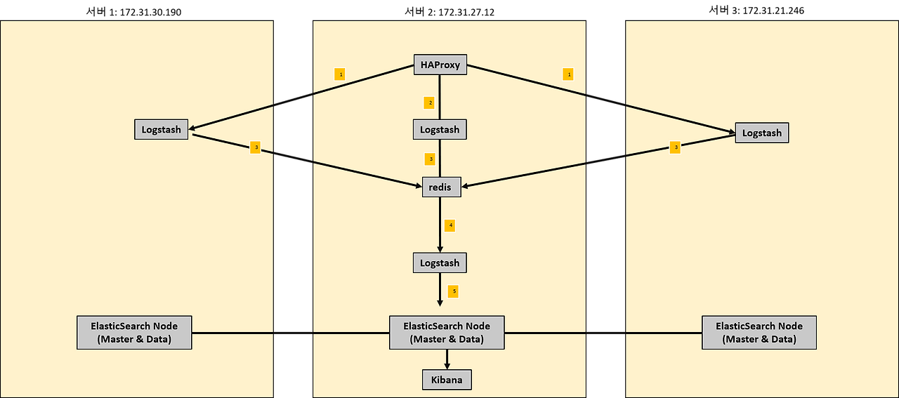 다중화 작업을 하기 위해서는 HAProxy와 Kibana는 별도 인스턴스 위에 동작해야 하며, 나머지 부분에 대해서 다중화를 진행해야한다. 이렇게 되면 인스턴스 3개 중에 2개가 이미 사용되버리고 만다.. 즉, 어차피 안고가야 하는 것이라면 인입점에서의 유실을 최소화 하는 데 집중하자는 것이 핵심이였다.