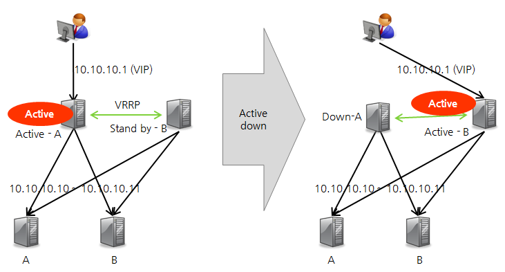 다음 그림과 같은 구성에서는 가상 IP 주소를 공유하는 active HAProxy 서버와 standby HAProxy 서버가 heartbeat를 주고 받으면서 서로 정상적으로 동작하는지 여부를 확인한다. active 상태의 서버에 문제가 발생하면 standby HAProxy가 active 상태로 변경되면서 기존 active HAProxy의 가상 IP 주소를 가져오면서 서비스가 무정지 상태를 유지한다. 다만 1초 정도의 순단 현상은 발생할 수 있다.