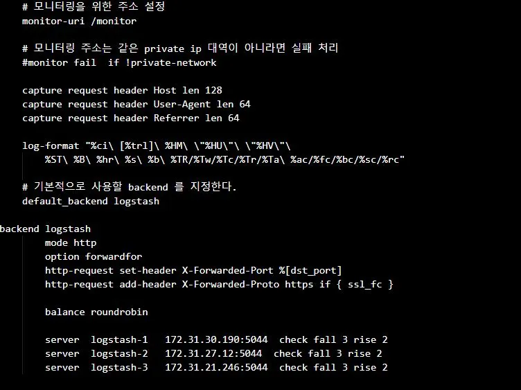 (server [host명] [ip]:[port] cookie [서버쿠키명] check inter [주기(m/s)] rise [서버구동여부점검횟수], fall [서비스중단여부점검횟수])