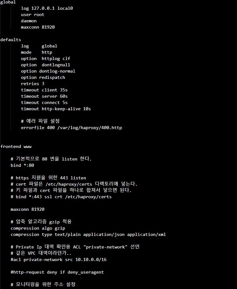 다음은 전역 옵션(global) 섹션과 기본 옵션(defaults) 섹션, 프록시 옵션 섹션(listen)의 주요 옵션에 관한 설명이다.