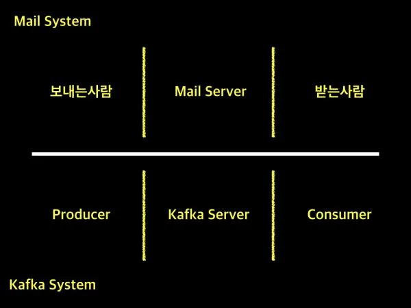카프카는 비동기 처리를 위한 메시징 큐의 한 종류이며, 프로듀서와 컨슈머가 있다. 대표적인 비동기 메시징 시스템인 메일과 비교하면 이해가 쉽다. 프로듀서는 카프카로 메시지를 보내게 되고, 해당 메시지는 카프카에 저장되어 보관중이게 된다. 그리고 컨슈머는 카프카에 저장되어 있는 메시지를 필요로 할때, 가져갈 수 있다.