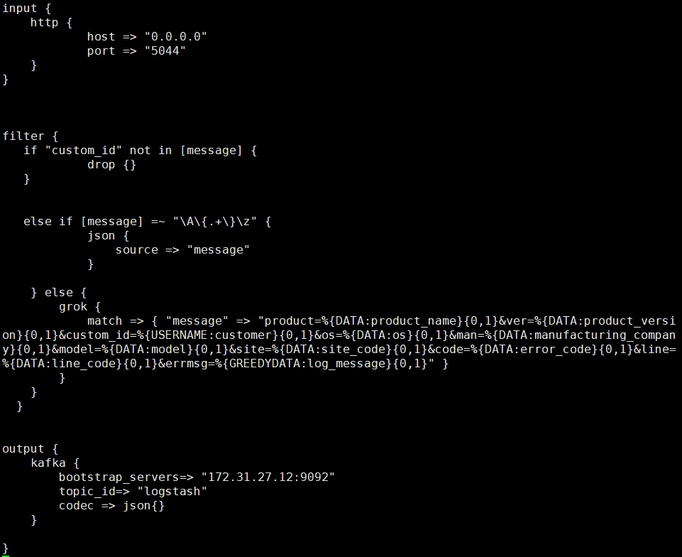 kafka에게 Producer 입장이 되어 logstash라는 토픽으로 메세징 큐를 쌓도록 한다. 형식은 json.