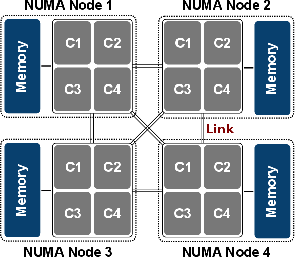그림에서 C1,2,3,4 등은 코어를 나타내며 각 node는 CPU(프로세서) 단위로 분할되어 있다.