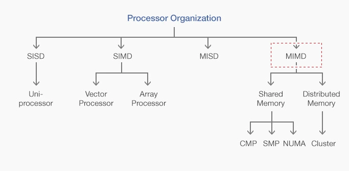출처 : https://www.samsungsds.com/global/ko/news/story/1203229_2919.htmlMIMD(Multiple Instruction, Multiple Data streams)은 여러 개의 명령어들이 여러 개의 데이터들을 동시에 처리하는 방식으로, 우리가 일반적으로 아는 멀티 프로세스를 포괄한다고 보면 된다. 여기서 우리가 봐야 할 것은 공유 메모리 시스템인 Shared Memory 부분이다. 크게 SMP와 NUMA로 보면 된다.