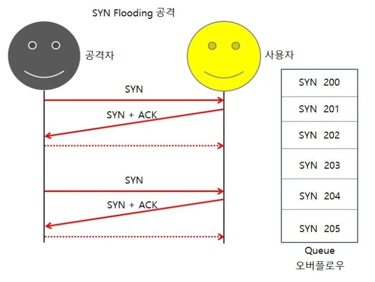 이러한 일반적인 절차에도 공격이 가능하다. 바로 Syn flooding 공격인데, 이는 말 그대로 Syn을 계속해서 보내 Syn 소켓을 담아놓은 저장 창고가 넘치게 하는 공격이다.