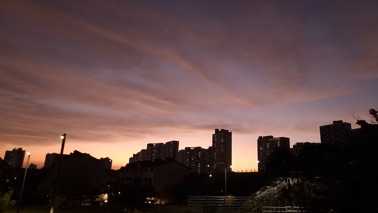 엄마 밥을 먹은 후로 집에 와서도 밥심을 발휘하려고 일요일 점심은 김밥을 말아먹고, 저녁엔 도로 치킨을 배달시켰다. 아직 치킨은 입맛이 돌지 않아 몇 개 안 먹고 포도로 배를 채웠다. 어찌나 배가 부른 지 아파트 단지나 한 바퀴 걸으려고 나왔는데 먼 하늘에 노을이 나를 기다리고 있었다.