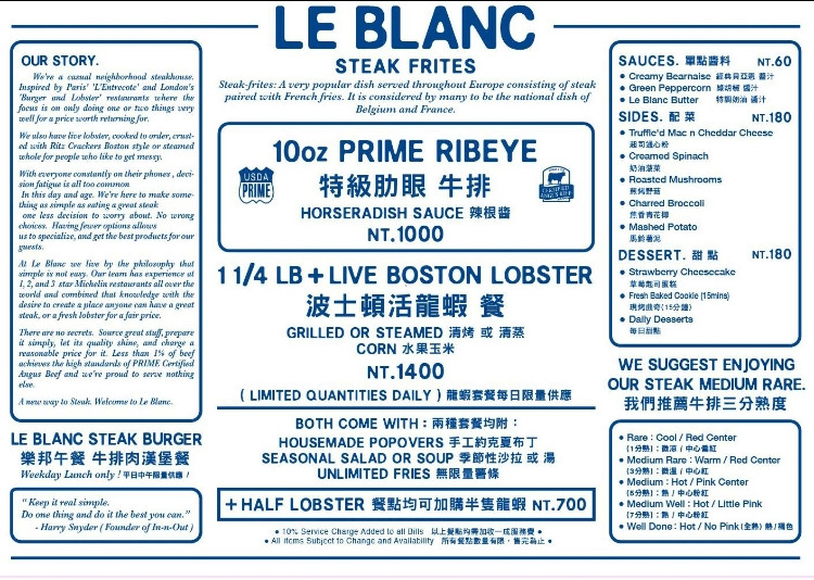 자리에 앉으면 영문으로 적힌 메뉴가 테이블에 깔린다. 타이페이에서 제일 '힙한' 스테이크하우스인 르블랑은 왼쪽 모퉁이 'OUR STORY'를 통해 바로 스토리텔링에 들어가는데...