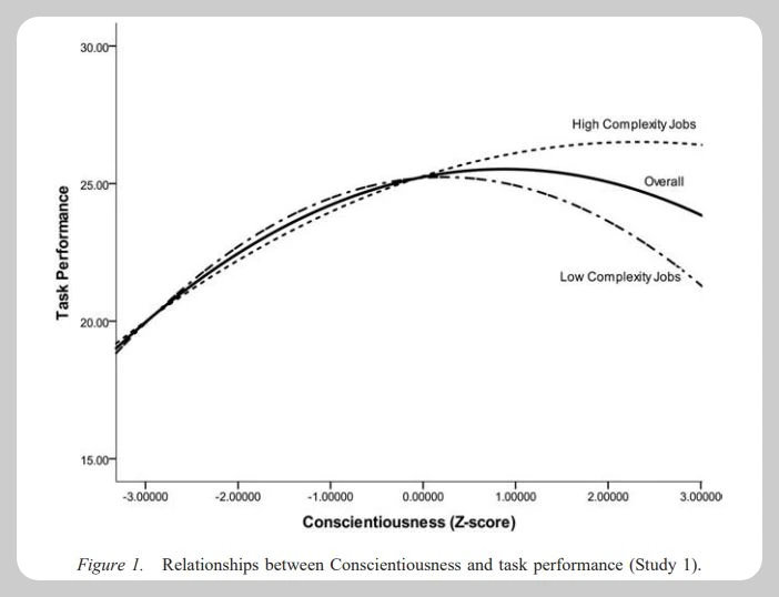 그래프를 통해 성실성(conscientiousness)은 직무성과(task performance)에 일정 수준까지는 긍정적인 영향을 미치는 것을 볼 수 있다. 하지만 너무 과한 성실성은 오히려 성과가 떨어지는 결과(U커브의 꼭짓점에서 하향하는 모습)를 확인할 수 있다.