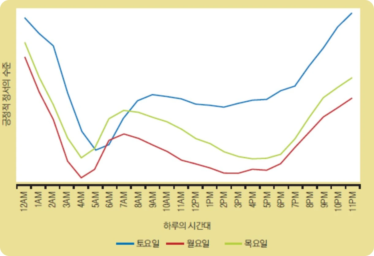 84개국, 240만 명이 트위터에 올린 5억 900만 개의 메시지 내용을 통해 기분 상태를 조사한 결과가 흥미롭다(Golder & Macy, 2011). 긍정적 정서(행복, 기쁨, 흥분..)와 부정적 정서(슬픔, 분노, 우울, 초조..)로 구분하여 독일, 미국, 중국, 일본을 분석해 본 결과 대부분 긍정정서는 금요일, 토요일에 최고조에 이르고 월요일이 최저로 나타났다.