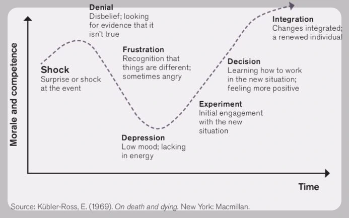 변화에 직면하면 사람은 일반적으로 몇 가지의 단계를 거치게 된다. 처음엔 약간의 충격(shock)과 기존의 생각과 방식을 고수하고 싶은 마음에서 거부감(denial)이 들어 에너지가 떨어진다(depression). 그 후 새로운 방식에 대해서 최초로 변화를 수용하는 단계로 진입한다. 그래도 뭔가 새로운 방식이 도움이 될 텐데.. 하며 몇 가지 실험을 해 본다(experiment). 그러면서 새로운 방식을 좀 더 깊이 이해하게 되고, 기대감이 형성되어 기분도 더 좋아진다. 좀 더 좋은 결과들로 연결될 수 있다는 기대감이 형성되면 곧바로 실행으로 옮기고 새로운 방식을 적용해 나아간다. 이렇듯 사람이 변화를 받아들이는 데에는 단계가 필요하고, 시간이 소요되는 것이다.