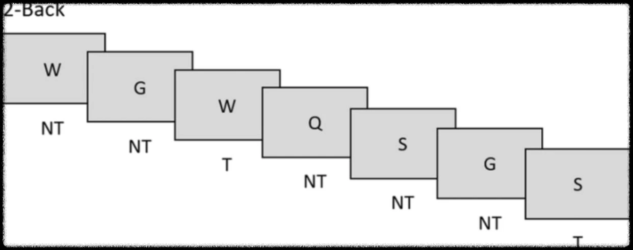 이번엔 2 단어, 3 단어 회상 작업(Two and Three-Back task)을 측정하였다. 멀티태스킹 정도에 따른 작업기억(working memory)과 집중력을 측정하는 것이 목적이었다. 우선 실험 참가자에게 알파벳을 읽어주고 "2번 전의 것(two back)과 같으면" Yes를, 그렇지 않으면 No를 누르는 방식으로 정확도를 측정했다. 같은 방식으로 "3번 전의 것(three back)과 같으면" Yes를, 그렇지 않으면 No를 누르는 방식이었다.