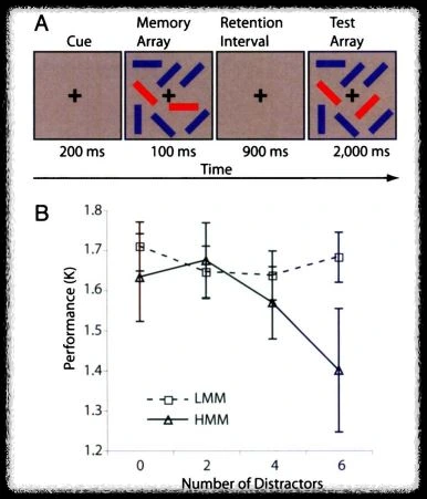 이 두 그룹에 각각 기억해야 할 화면을 순서대로 보여주었다. 첫 번째, "Cue(준비)"화면을 보여 준 후, 두 번째, "Memory Array(기억)"화면에서 빨간색 네모의 방향을 기억시켰다. 이때 파란색 네모는 방해요인(distractor)으로 주의를 분산시키려는 실험의도다. 시간을 두고 "Cue"화면을 다시 보여 준 후 마지막으로 "Test Array(테스트 화면)"을 보여주었다. 그다음 첫 번째 화면과 마지막 화면의 빨간색 네모의 방향이 바뀌었는지 안 바뀌었는지를 테스트했고, 파란색 네모(방해요인)의 변화에 따른 정확도를 측정했다.