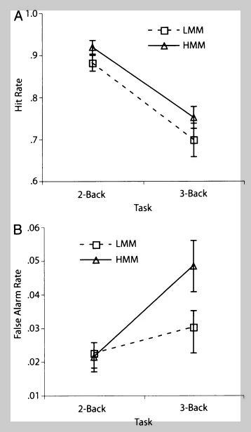 연구결과(아래의 B 그래프) 고 멀티태스킹 그룹(HMM)에서 잘못 누르는 비율이 3-back task에서 급격히 늘어나는 것을 알 수 있었다. 좀 더 많은 기억을 필요로 하는 환경에서 실수가 많이 발생하는 것으로써 이 역시 "멀티태스킹을 할수록 기억력과 집중력이 떨어진다"는 점을 시사한다.