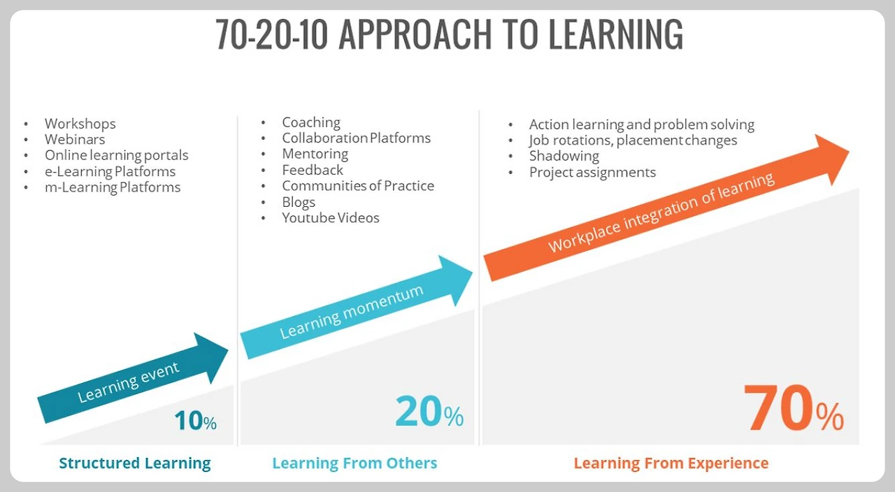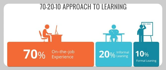직원들은 일과 관련한 다양한 경험을 하면서 학습하게 된다. 예를 들어, IT 전문가인 경우 시스템에 문제가 생기면 다양한 관점에서 문제를 해결하기 위한 방법을 배우게 된다. 만약, 재무업무를 담당하는 사람이라면 숫자계산에 대한 업무효율을 향상하기 위해 엑셀수식이나 관련 스킬을 배운다. 이외에도 발표를 해야 할 때면 멋진 PT 슬라이드를 만들기 위해 관련한 새로운 기능들을 배워야 한다. 어려운 과제는 관련 스킬을 몇 단계 더 향상하는 기회가 된다. 70:20:10 모델에 의하면 이러한 직무와 관련한 경험학습이 차지하는 비율이 전체의 70%가 될 정도로 높다.