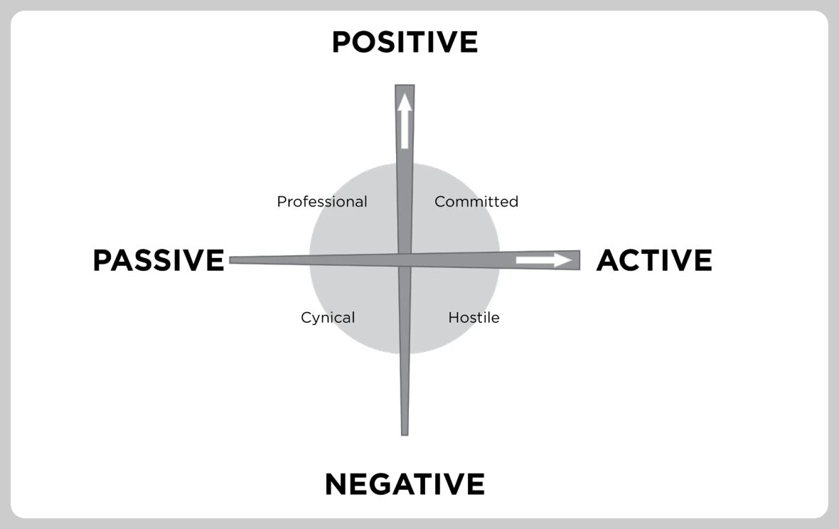우선 조직에 대한 긍정성 인식과 부정성 인식, 그리고 일에 대한 능동적 태도와 수동적 태도로 구분해 본다면 현 상태에 대한 이해와 효과적인 지원도 가능해질 것 같다.
