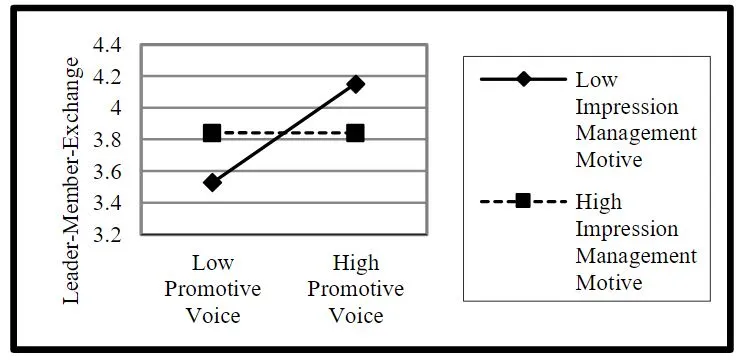 같은 맥락에서 아래의 그래프를 살펴보면, 인상관리 동기가 낮은 사람의 경우에 관계의 질과 발언행동(promotive voice) 간의 관계에서 정적인 조절효과를 나타낸다. 인상관리를 할 이유가 없을 때 조직에서 하고 싶은 말을 더 거침없이 한다는 뜻이다. 반면 인상관리 동기가 높은 사람은 발언행동에 따른 관계의 질에는 변화가 없는 것으로 나타났다.